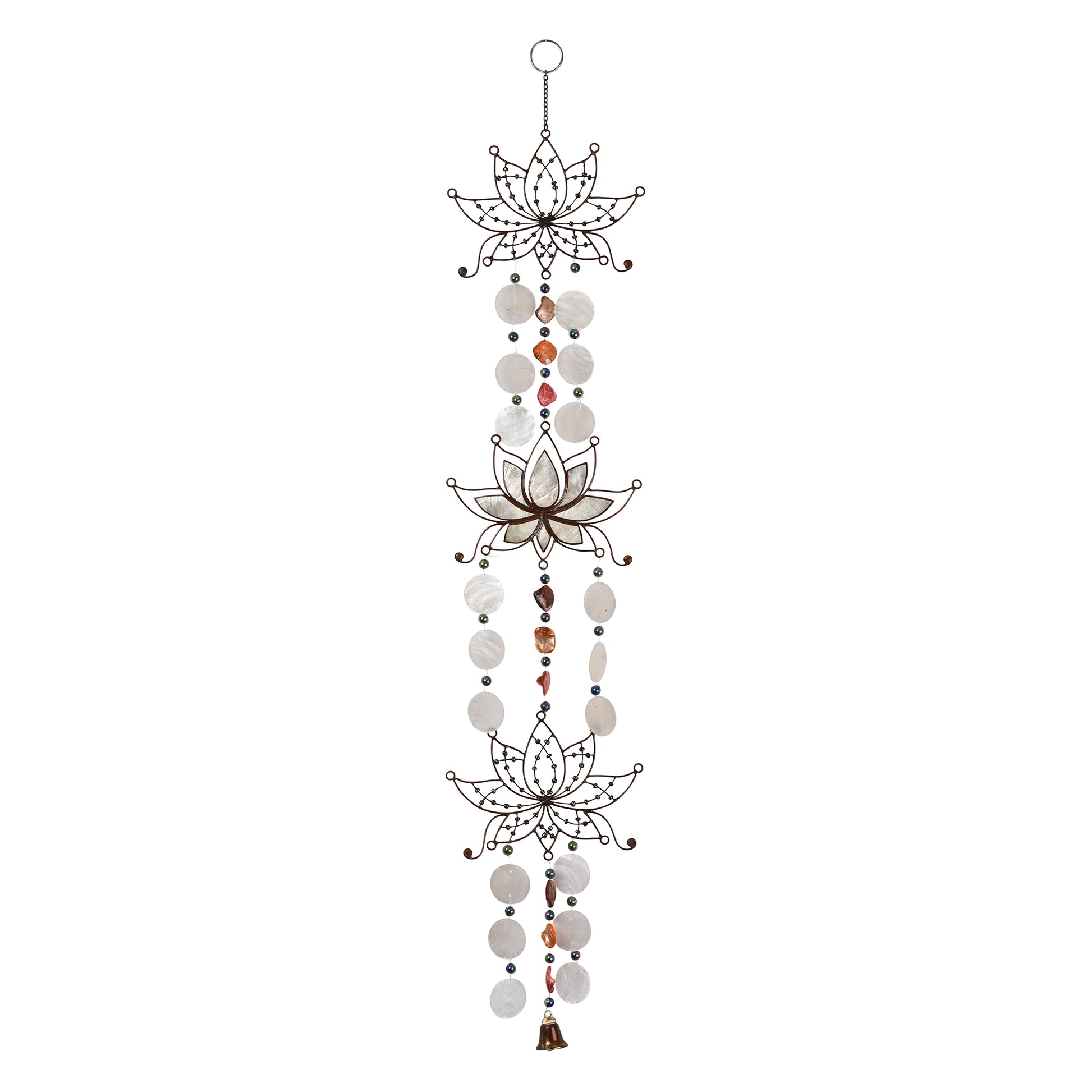 Stunning lotus chime handmade with capiz, shells, beads, wire, and a bell. Delightful addition to an outdoor or indoor space. Top and bottom wire lotus come adorned with beads, middle lotus is decorated with capiz.