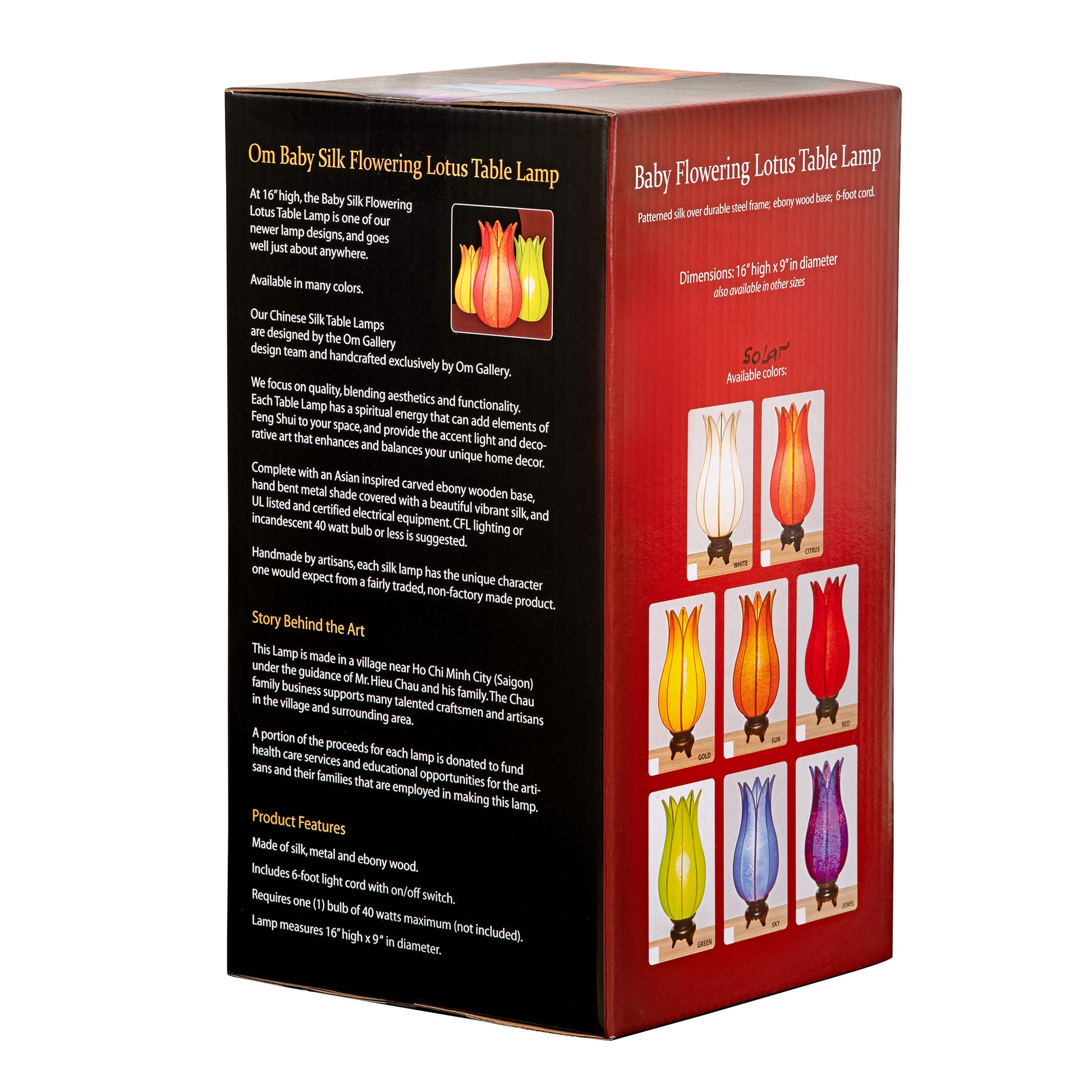 One of our newer lamp designs, at 16" high, the Baby Flowering Lotus table lamp goes well just about anywhere. Made with a durable steel frame, this high-quality silk table lamp is perched on an ebony wood base. This Om Gallery silk blooming lotus table lamp is the perfect complement to any room in the house or as a gift.