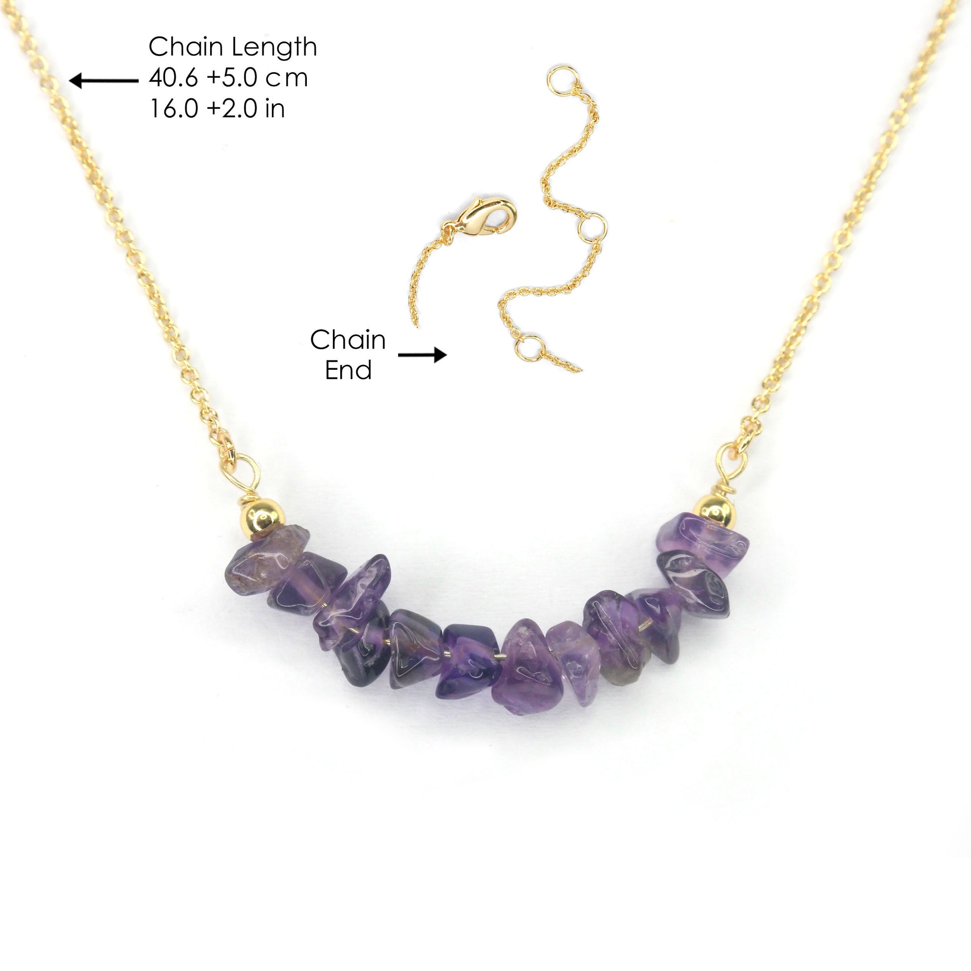Om Gallery's Healing Stones Necklace in Amethyst is a captivating piece that harmonizes natural beauty with the therapeutic energy of gemstones. This necklace is meticulously crafted and boasts a delicate chain adorned with radiant Amethyst stones at its focal point.