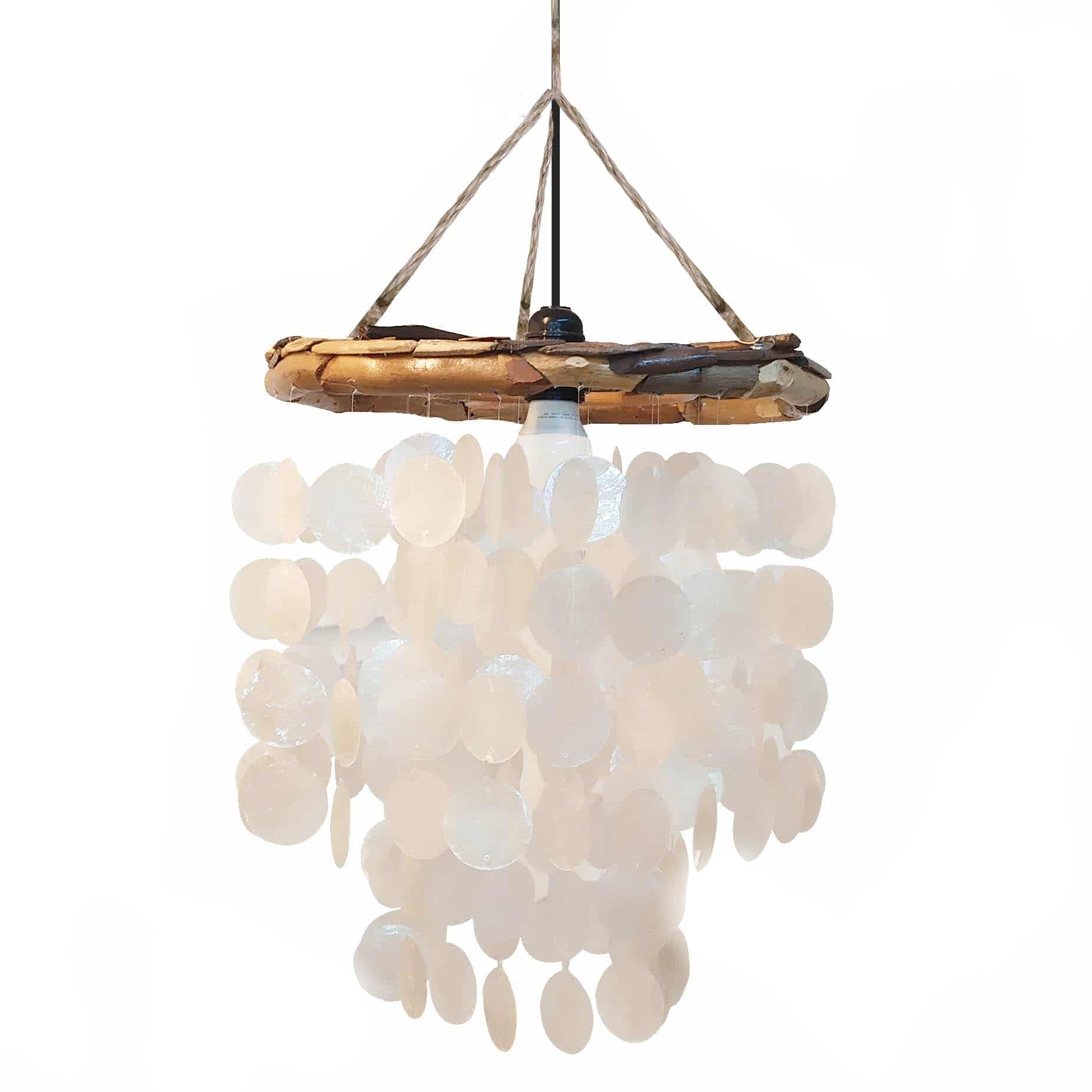 Handmade Driftwood and Capiz Shell Hanging Light Chandelier designed and created by Om Gallery Artisans. Made in the Philipinnes from natural materials. Dimensions 14" x 14" x 16". Includes Electrical Cord.