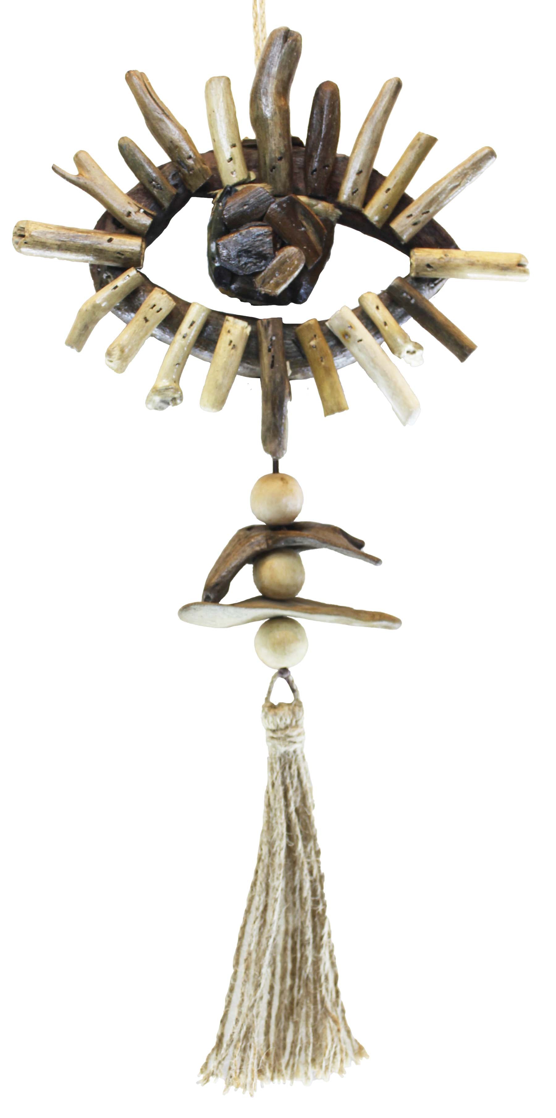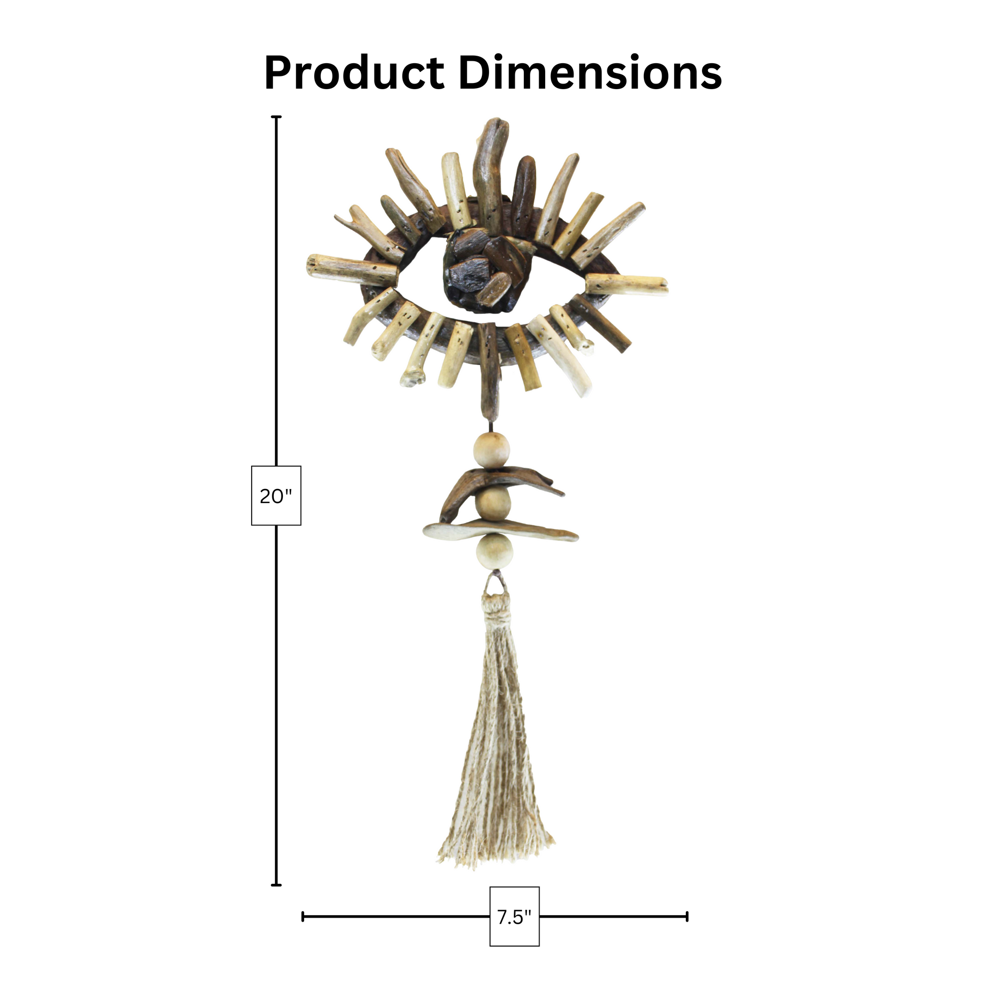 Om Gallery's Hanging Mod Eye Ornament is a captivating fusion of style and natural beauty, meticulously crafted from natural driftwood. Measuring 7.5 inches in width and 20 inches in height, this ornament adds whimsy and personality to indoor and outdoor spaces.