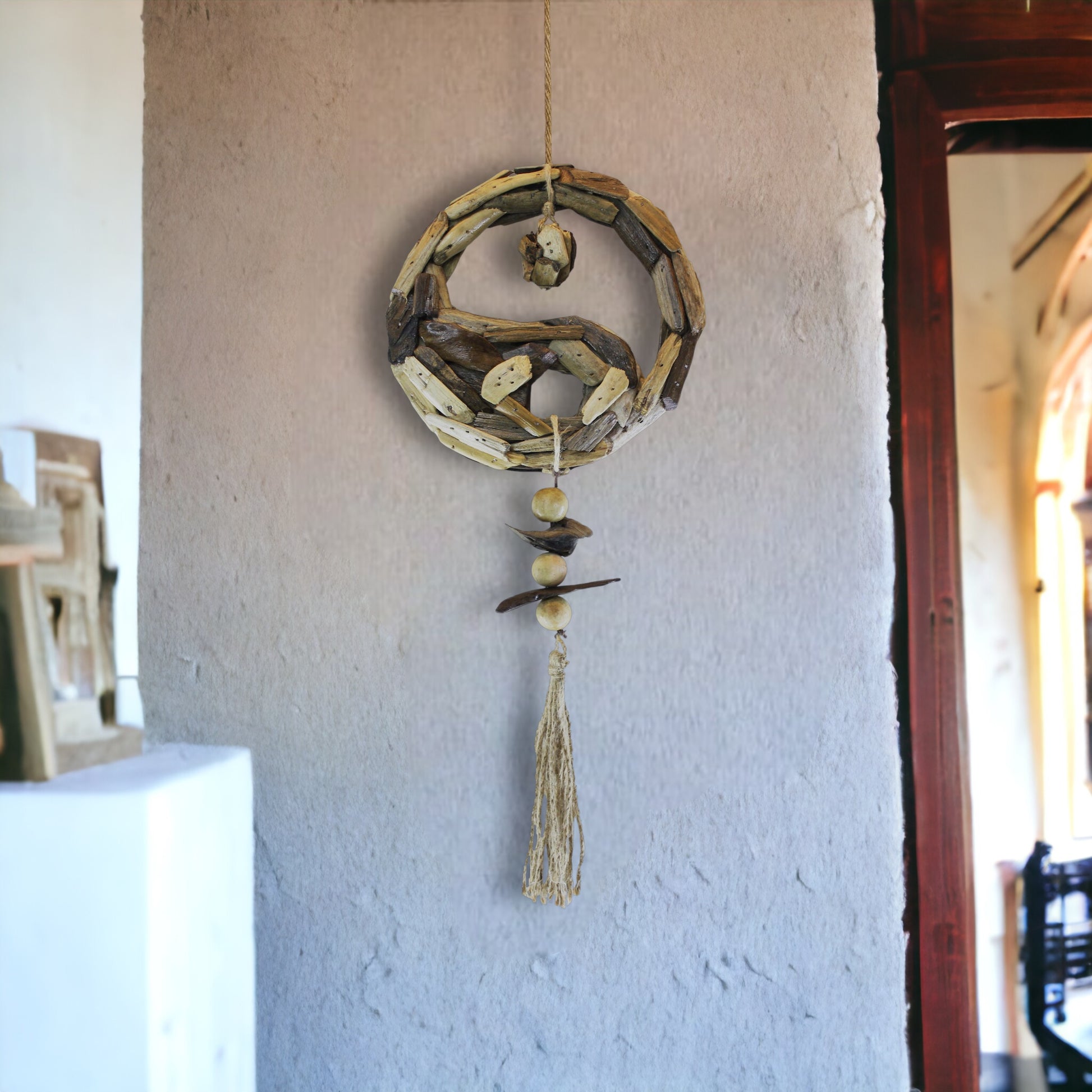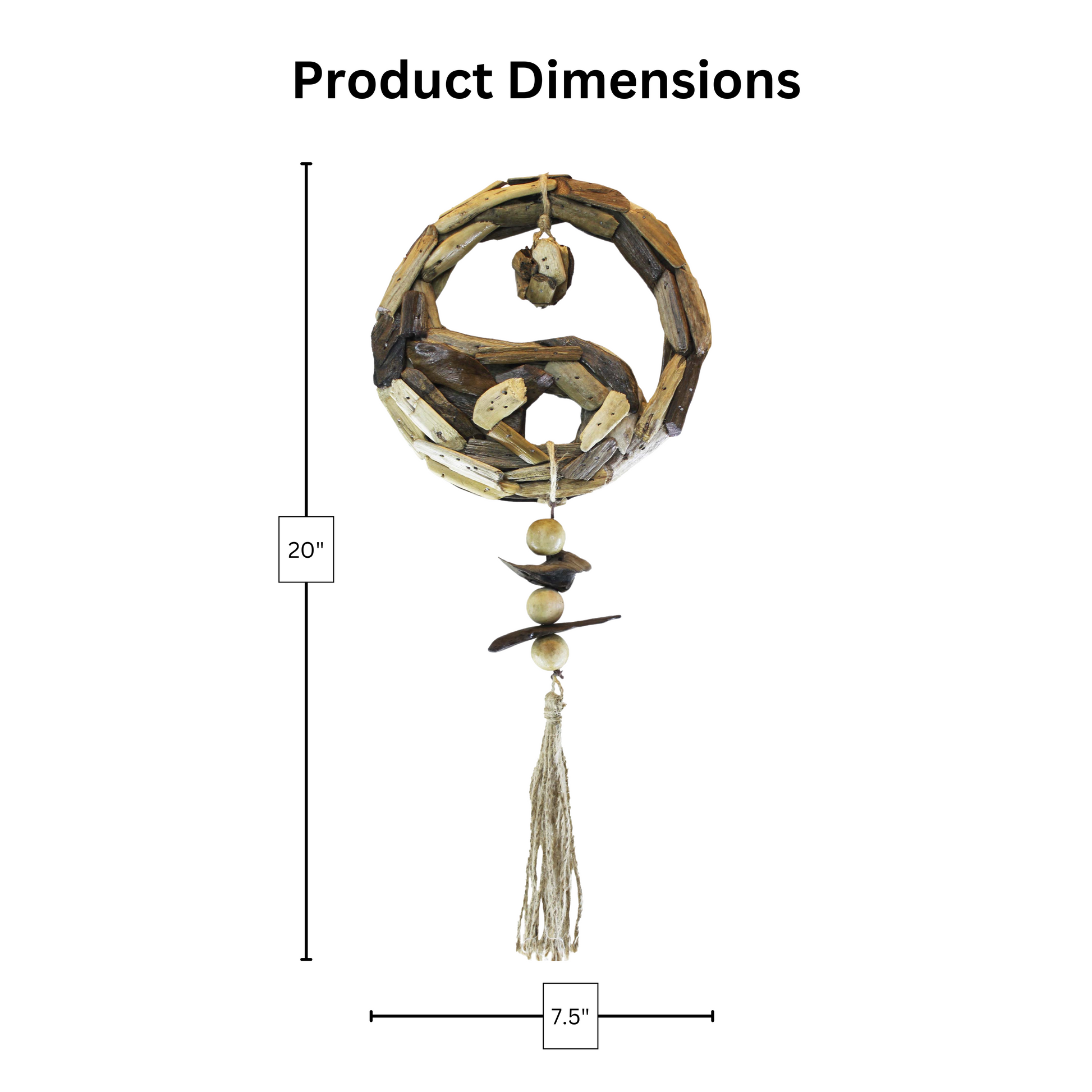 Om Gallery's exquisite Hanging Yin Yang Ornament combines harmony and natural beauty. This stunning ornament features the iconic Yin Yang symbol intricately fashioned from weathered driftwood. Measuring 7.5 inches in width and 20 inches in height, this piece is a captivating focal point for indoor and outdoor spaces.