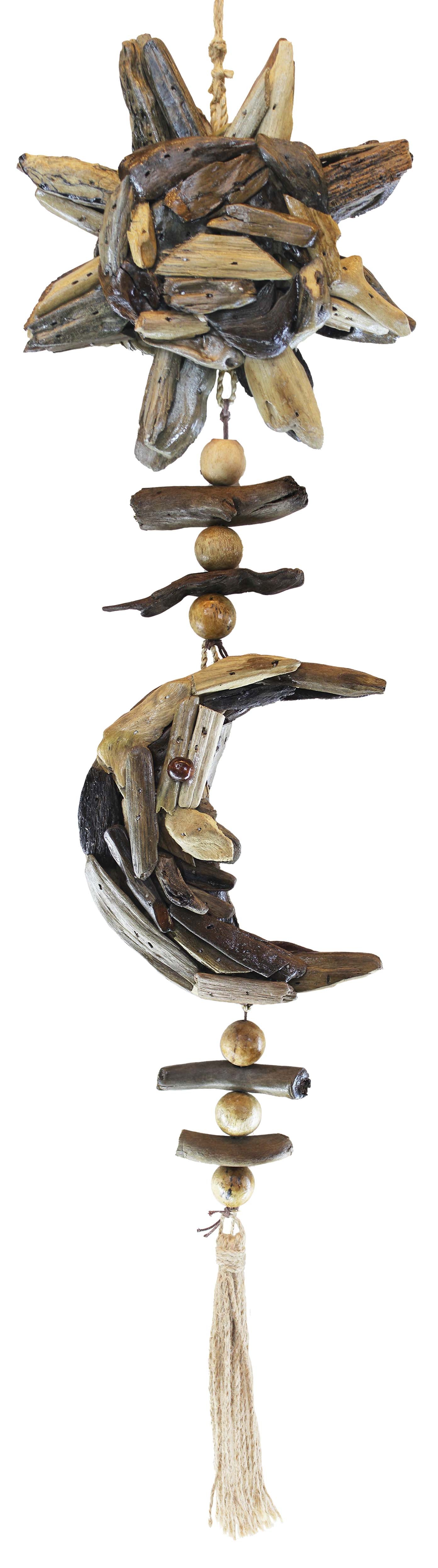 Om Gallery's Hanging Driftwood Double Sun and Moon Ornament is an exquisite piece featuring two iconic symbols - the sun and the moon - intricately crafted from natural driftwood. Measuring 7.5 inches in width and 33 inches in height, this ornament adds a touch of celestial beauty and harmony to both indoor and outdoor spaces.