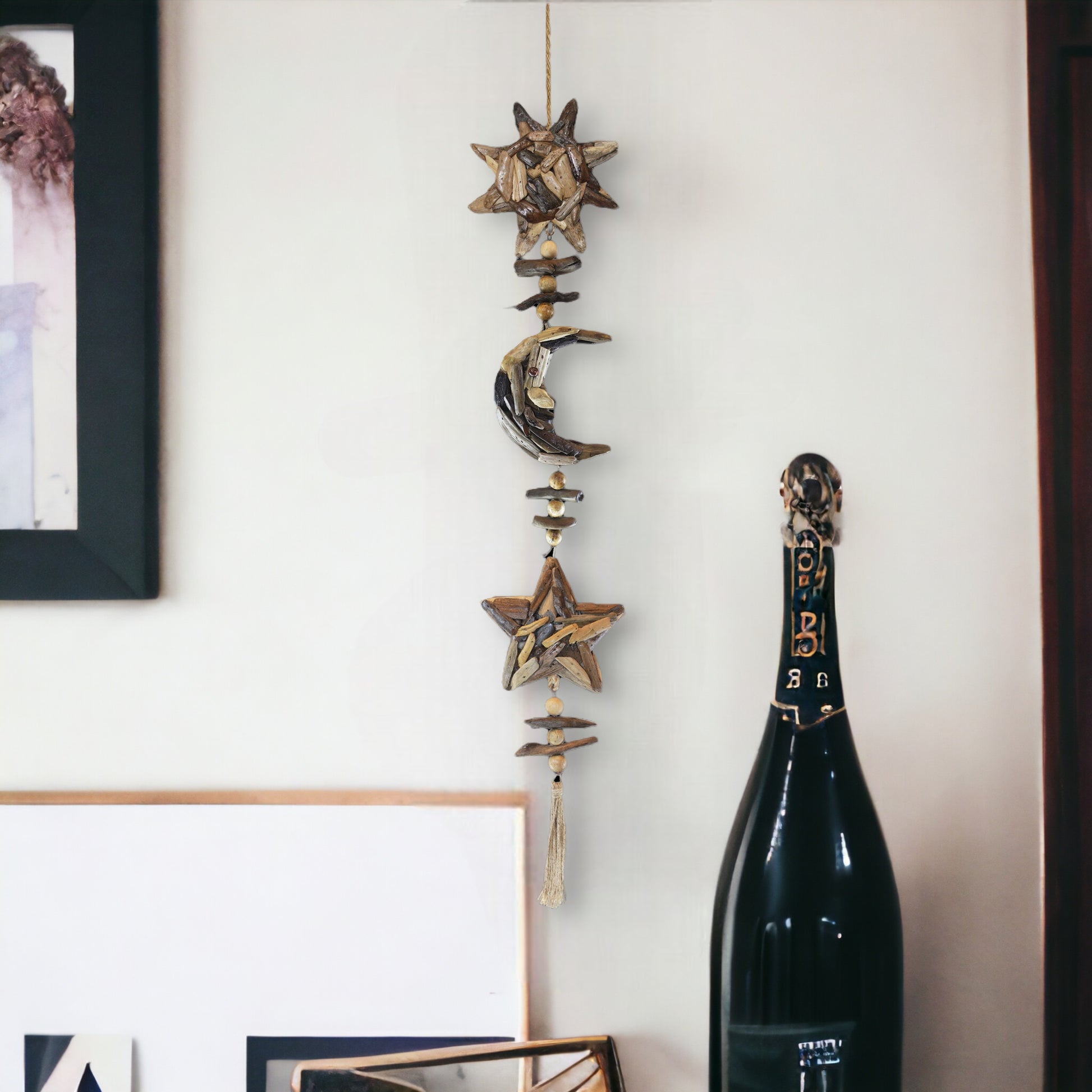 Each element of the ornament is meticulously handcrafted by our skilled artisans in the Philippines, ensuring a unique and artisanal touch to every piece. The use of driftwood adds a rustic charm and organic texture, enhancing the allure of the celestial symbols.