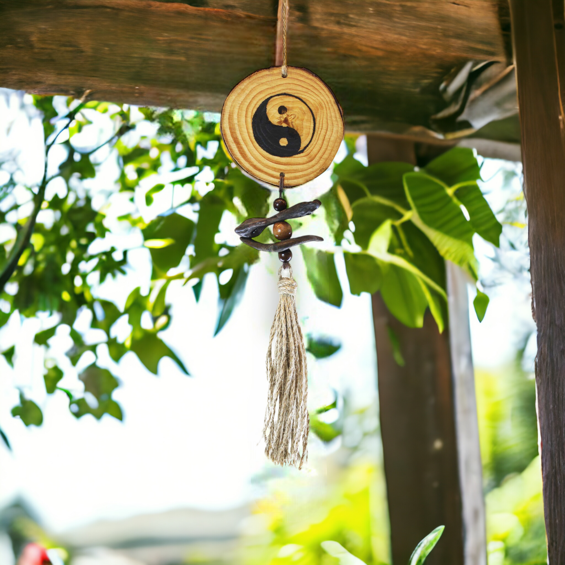 Bring balance and harmony into any space with Om Gallery's Hanging Yin Yang Pine Slice Ornament. Crafted from a natural pine slice, this beautiful ornament features a meticulously hand-painted Yin Yang symbol, symbolizing the perfect equilibrium of opposites. Enhanced with earth-toned wooden beads and two polished driftwood pieces, this piece gracefully embraces nature’s simplicity. A soft jute tassel completes the look, adding a subtle touch of rustic charm.