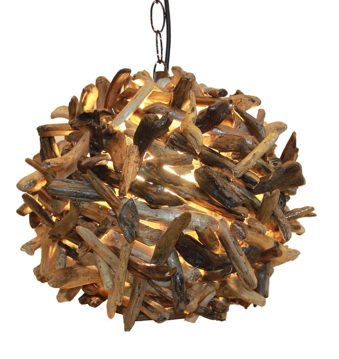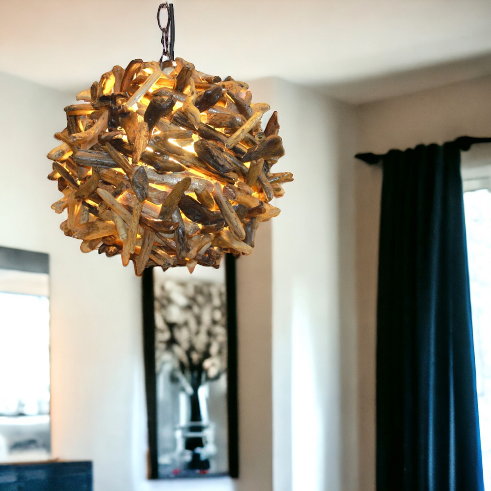 Each piece of driftwood is carefully selected and arranged to form a spherical shape, creating a captivating interplay of light and shadow. The driftwood's intricate textures and earthy tones add a touch of rustic sophistication to any room, while the soft glow of the light creates a cozy and inviting atmosphere.