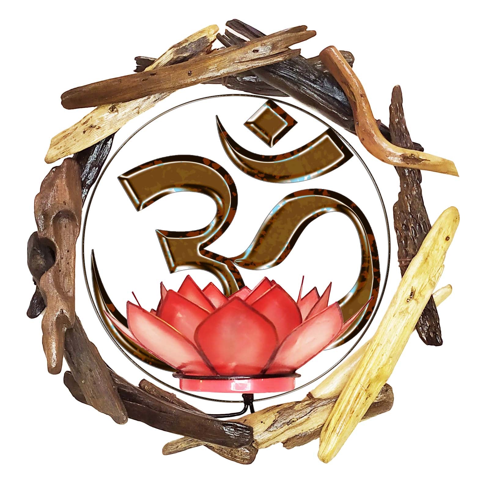 Whether mounted on a wall indoors in a meditation room, yoga studio, or living space, or displayed outdoors on a patio, porch, or garden wall, this driftwood Ohm lotus sconce creates a captivating focal point and casts a warm, inviting glow when lit with a tea light.