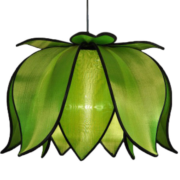 Om Gallery's stunning Hanging Flowering Lotus lamp is the perfect accent light for any room of the home or office. 100% handmade with fine taffeta silk by skilled Vietnamese craftspeople, the hanging Flowering Lotus lamp is made with the highest fair trade principles in mind. Combining the beauty of the lotus -- a symbol of peace, purity, holiness and harmony -- and the usefulness of a hanging light, we're sure you'll love the Om Hanging Flowering Lotus lamp! Made with a durable steel frame and high-quality silk. Hangs from a 12' black lighting cord.